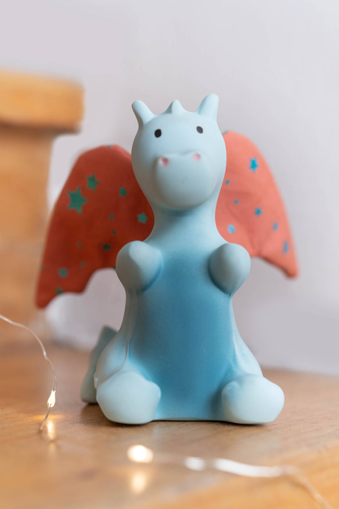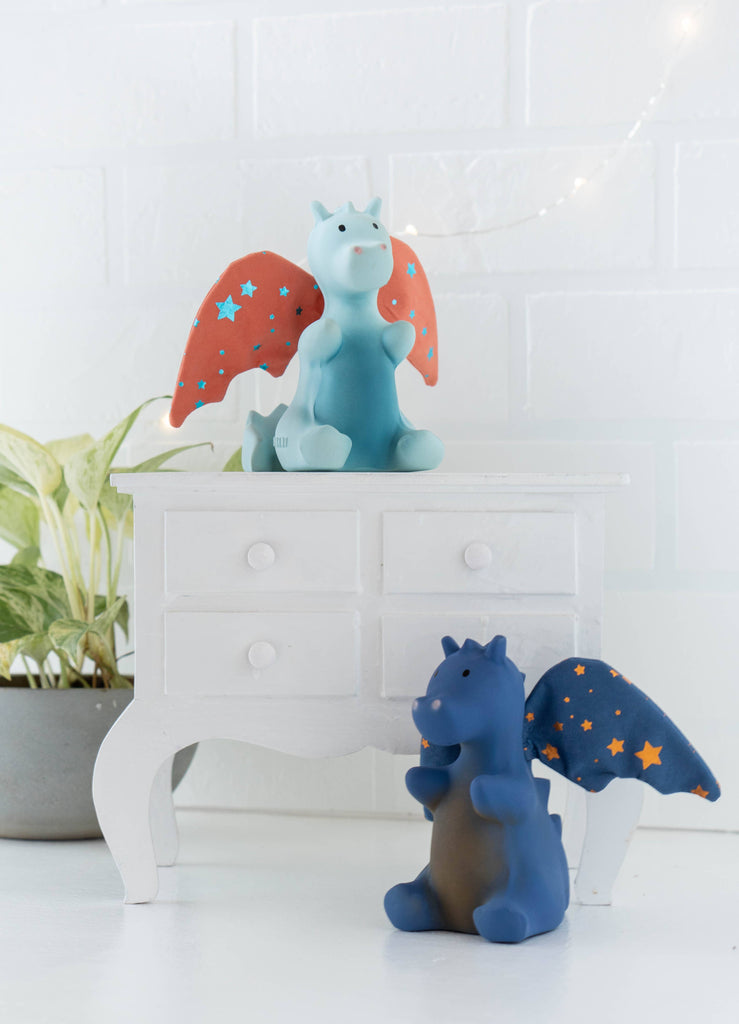 Baby Sunrise Dragon Natural Rubber Rattle with Crinkle Wings This magical character from our Fairytales Collection is ideal for teething babies. It’s made with all-natural rubber and hand-painted with soy-based ink, easily gripped by tiny hands, and is designed with both soft and hard parts to help soothe a baby’s irritated gums. Plus, its crinkly wings help them explore their senses of touch and sound.