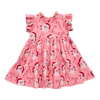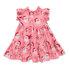 Sugar and Spice! Candy canes are definitely in Santa's sack so make sure you've been good and you're on his list this year! Sweet and spicy candy canes and jolly stocking-capped Santas mix and mingle on our flock favorite Girls Jennifer Dress. The soft fluttery ruffled neckline and sleeves and an extra twirly fully-lined and gathered two-tiered skirt will inspire endless merry making.