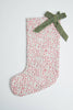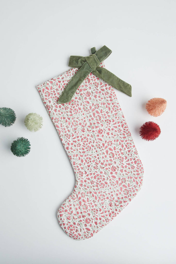 Celebrate timeless traditions with our quilted hand block printed stocking adorned with a velvet bow and loop for hanging.