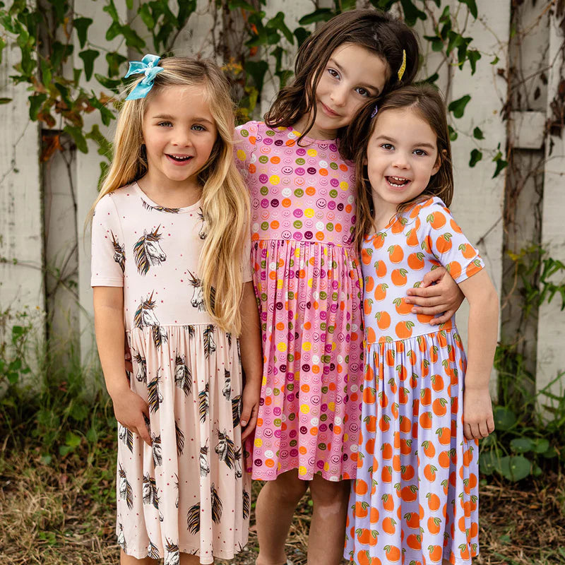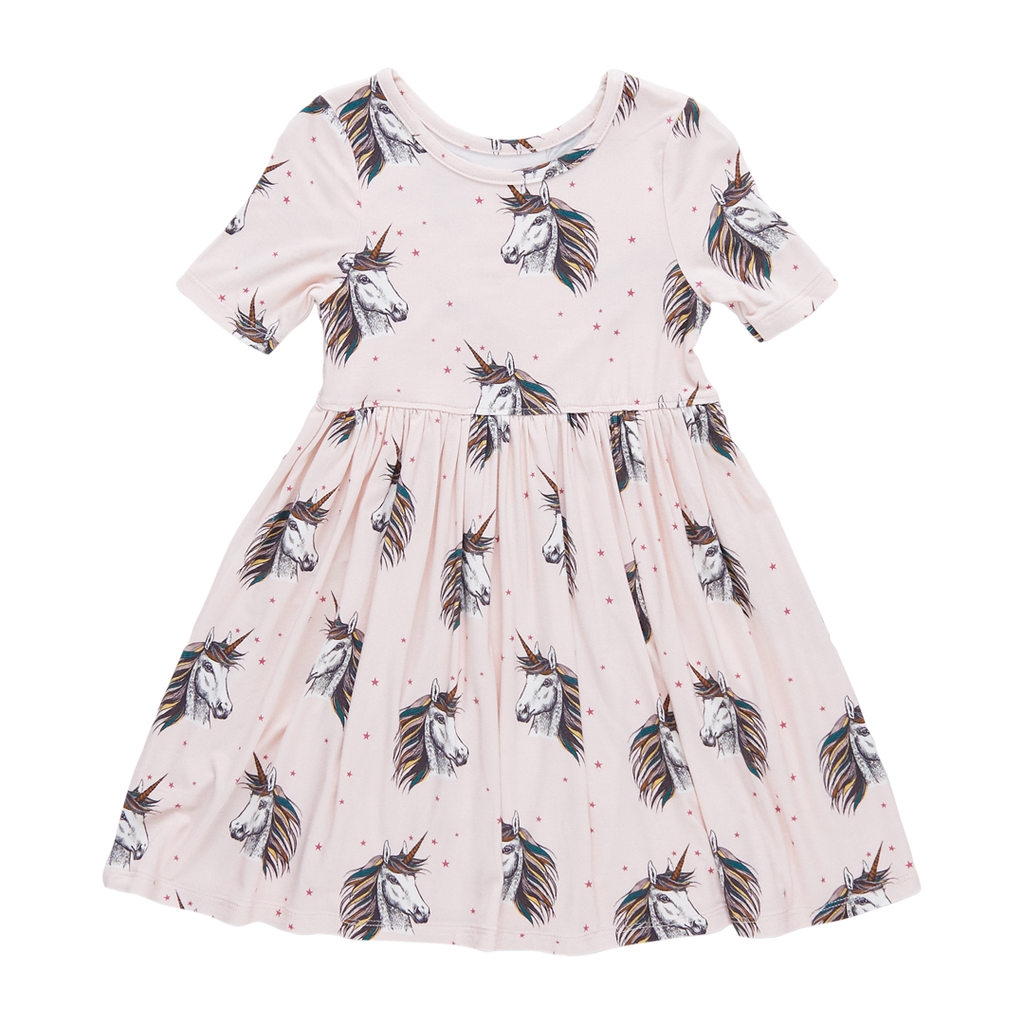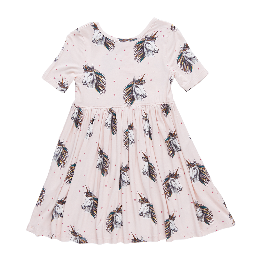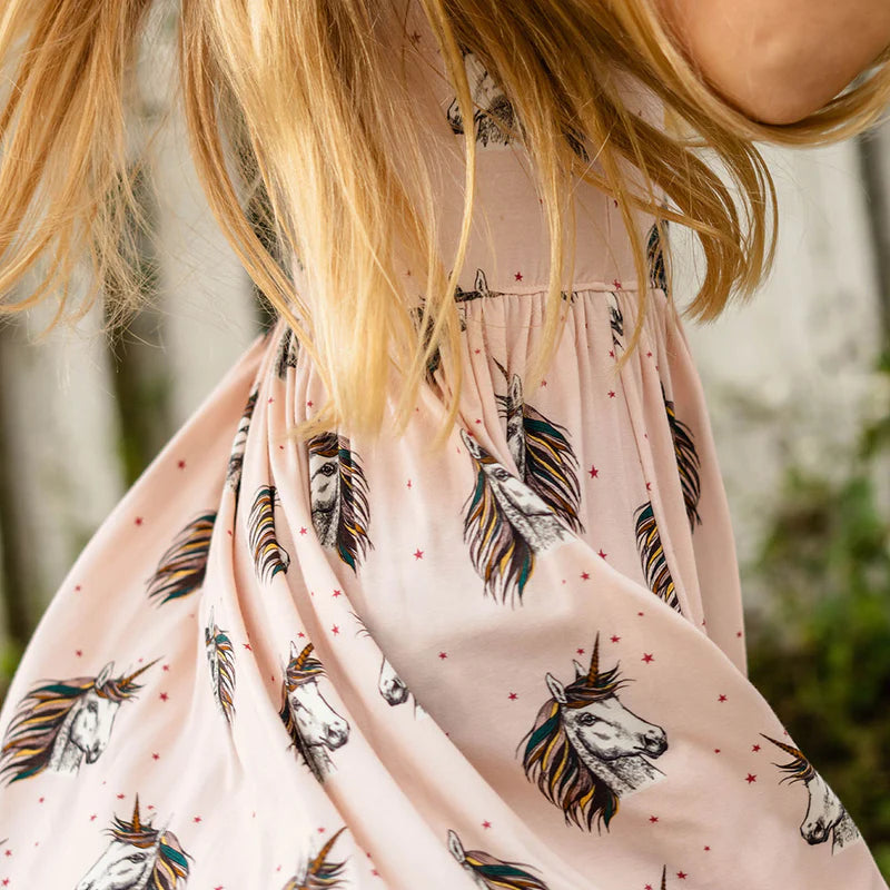 Let your imagination run wild with our adorable Pink Unicorns print on the Girls Bamboo Steph Dress! This magical dress is crafted in Bamboo fabric, and is crazy soft with a smooth, silk-like texture. You're little one will love to take a twirl in this dress that is both cute and comfy. Perfect for lounging at home, the playground, or a fun party!