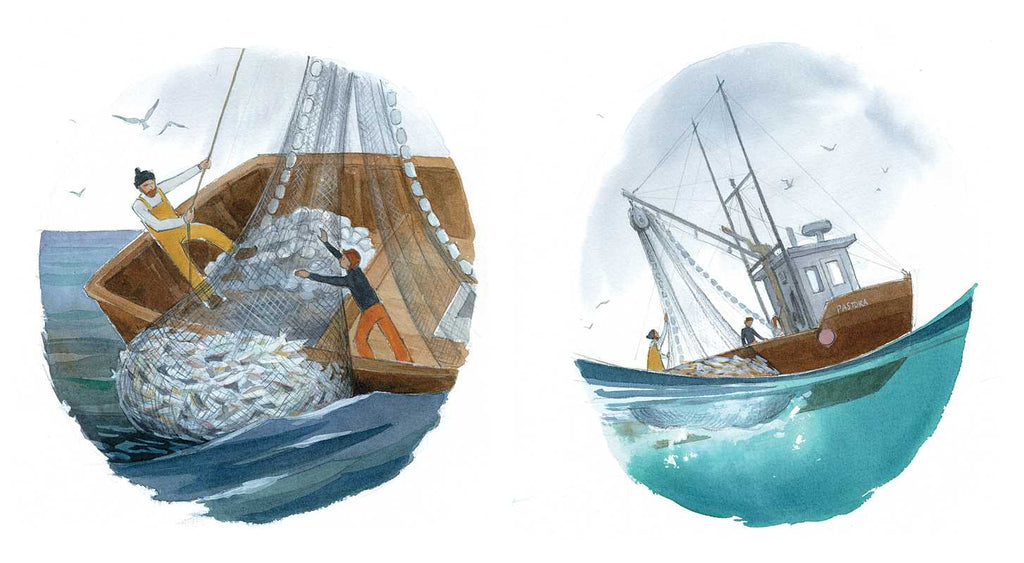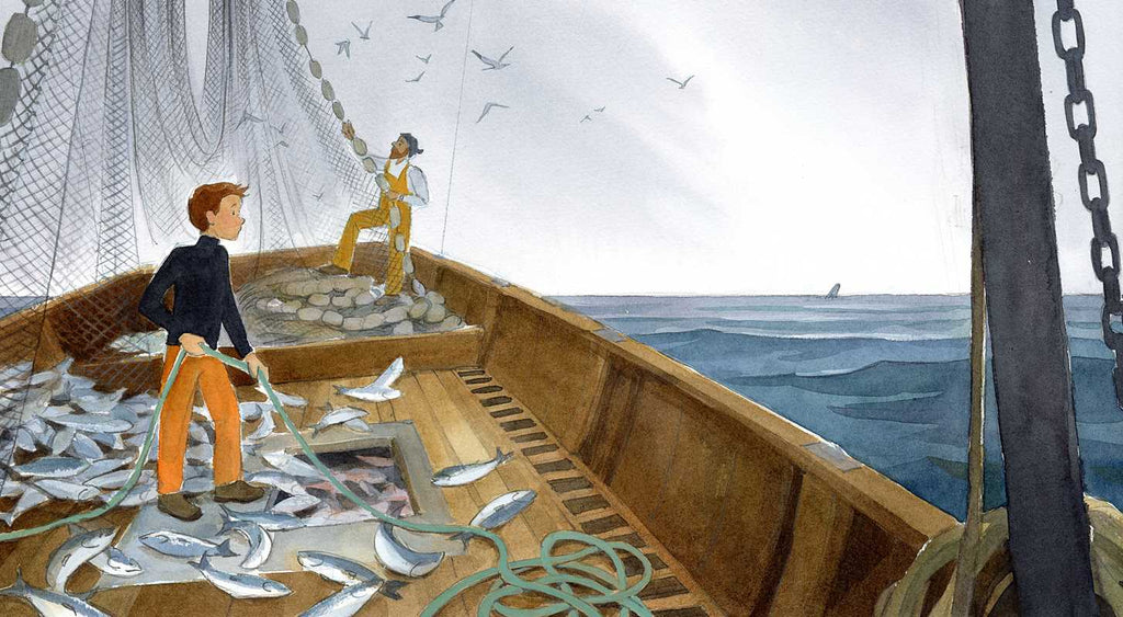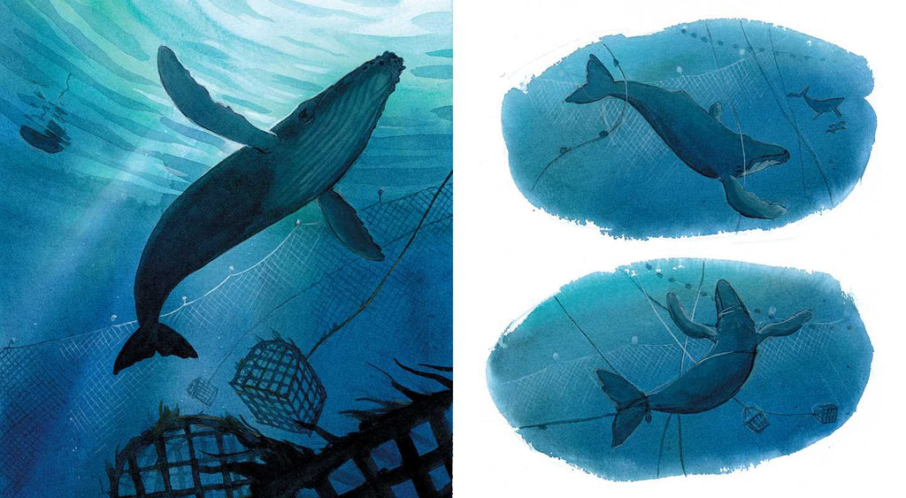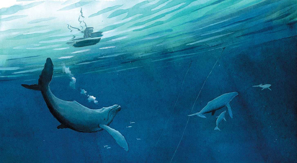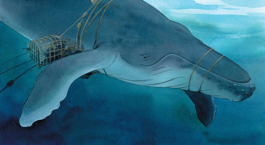 Jessica Lanan’s dreamy and dramatic watercolor paintings bring to life a wordless story about wonder in the natural world. A fisherman takes his son for a trip out on the water. When they encounter a whale entangled at sea, they realize a connection that transcends the animal kingdom.