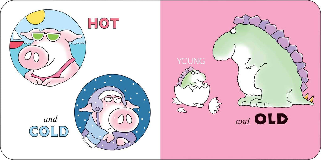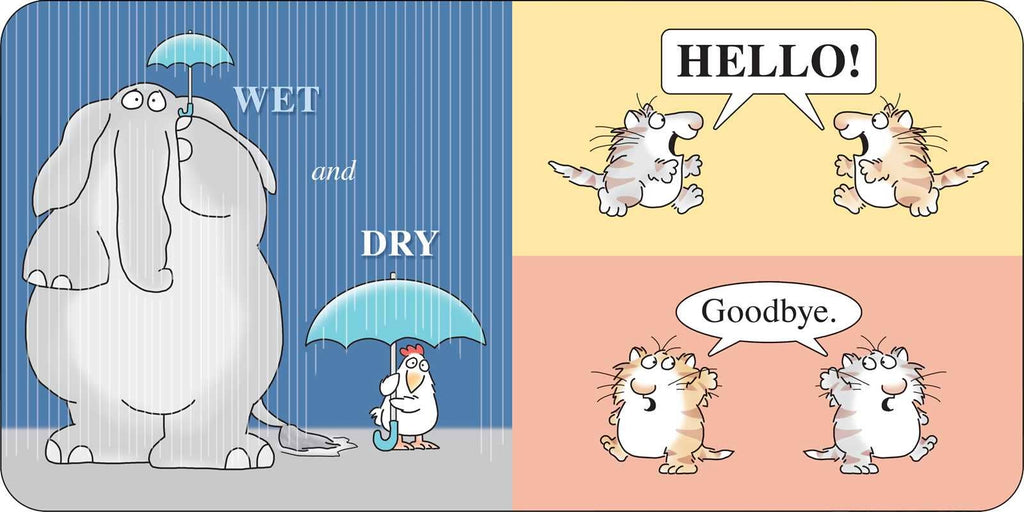 Boynton’s delightful rhyming text and whimsical cast of animal characters, who play on a teeter totter, lift weights, talk on the phone, and hide under umbrellas, perfectly complement the concept of opposites while introducing little readers to new words and juxtaposing ideas. Hot and cold Young and old Wet and dry Hello! Goodbye.