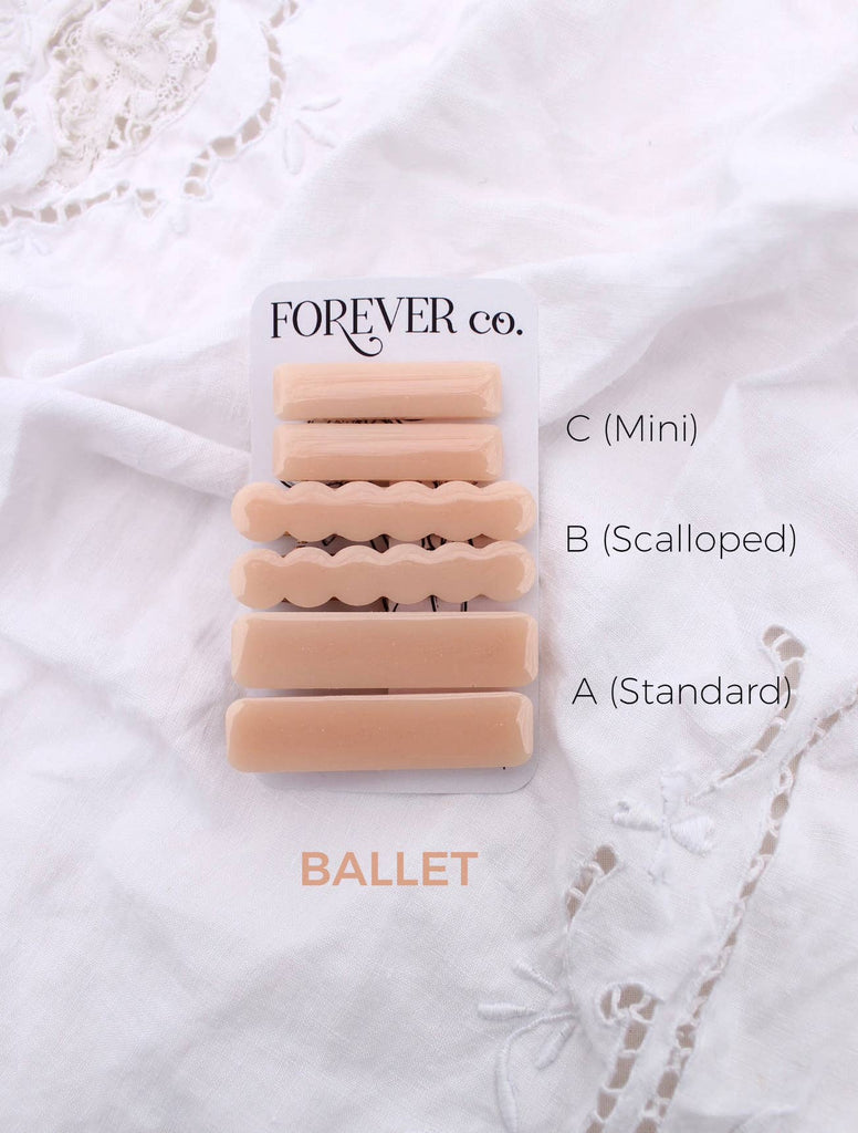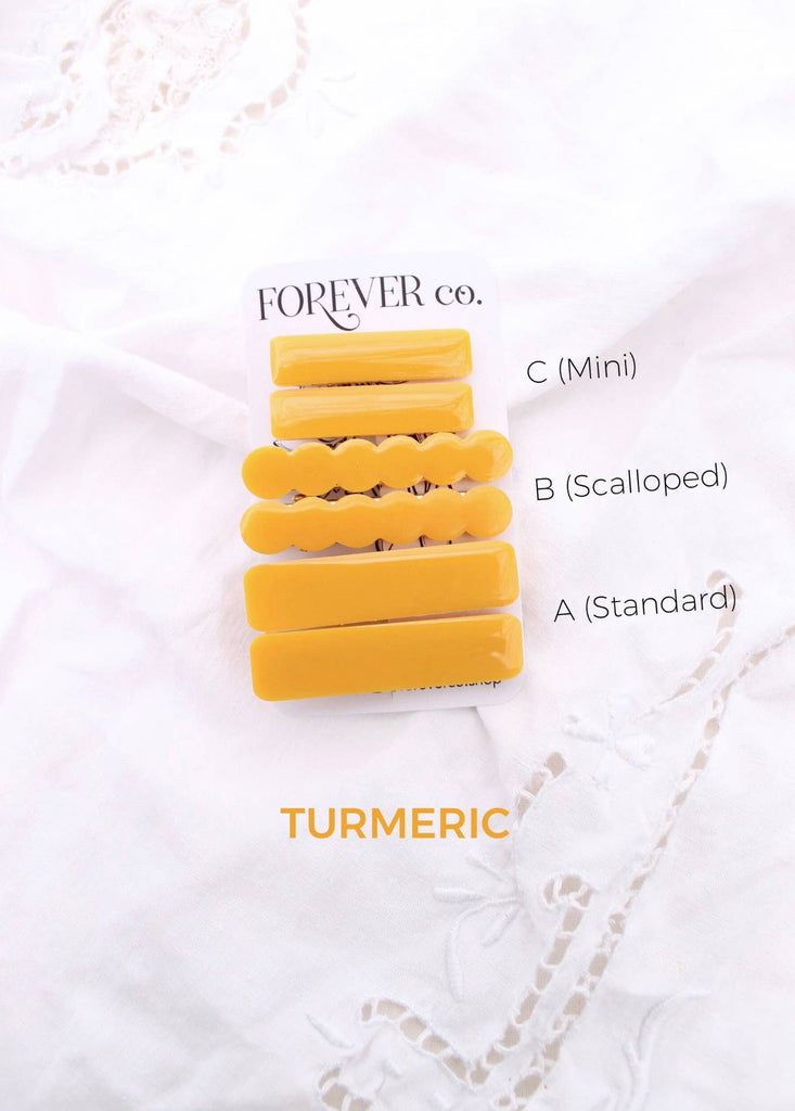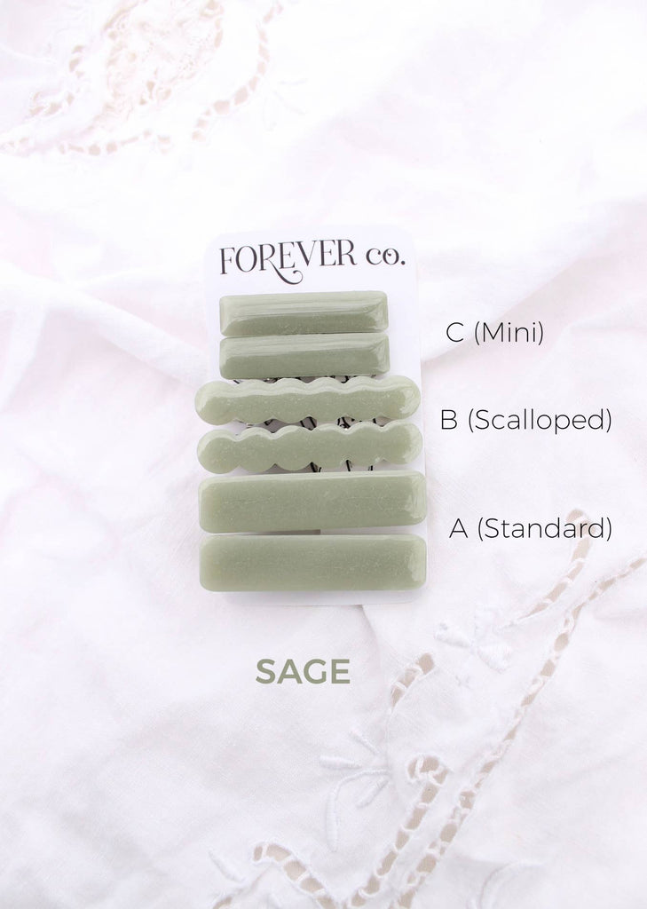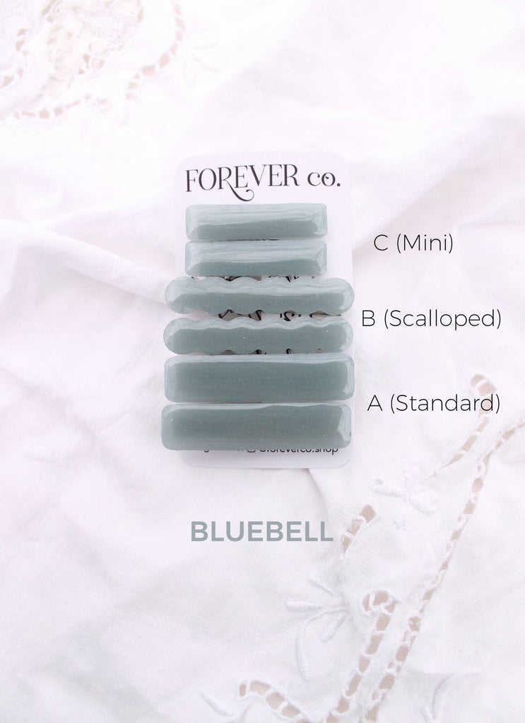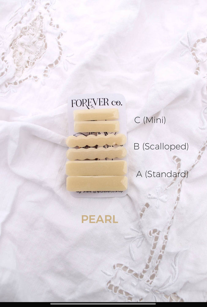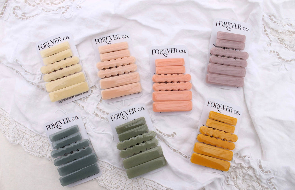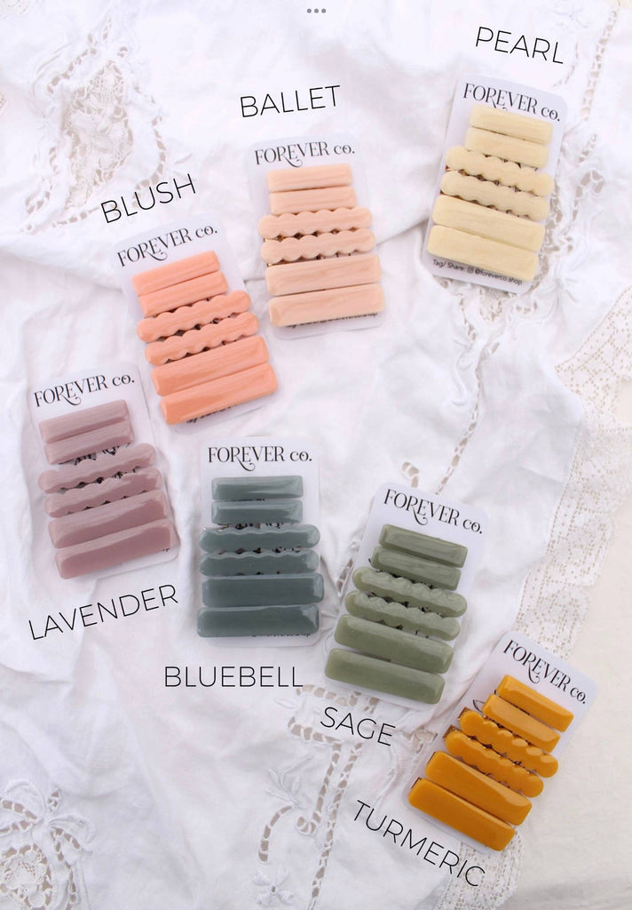 Popular with a variety of ages and styles, these Pastel Tone Resin Clips are a fun way to accessorize or tuck away stray hairs/ bangs. High-quality hair clips attached to hand-poured resin make for a one-of-a-kind look. These come in sets of 2. These clips measure as such: A (standard): 2” x .5” B (scalloped): 2” x .375” C (mini): 1.5” x .375” A & B are great for kids to adults, and C fits toddlers (or babies with a lot of hair) best. C is often popular with adults wanting to tuck back a bit of hair, so truly all sizes are popular with all ages. When worn by young children, please supervise and do not allow them to put the clips in their mouths. Because they are handmade, there may be some tiny air bubbles or imperfections, but are typically not noticeable or hidden on the back of the barrette near the clip.